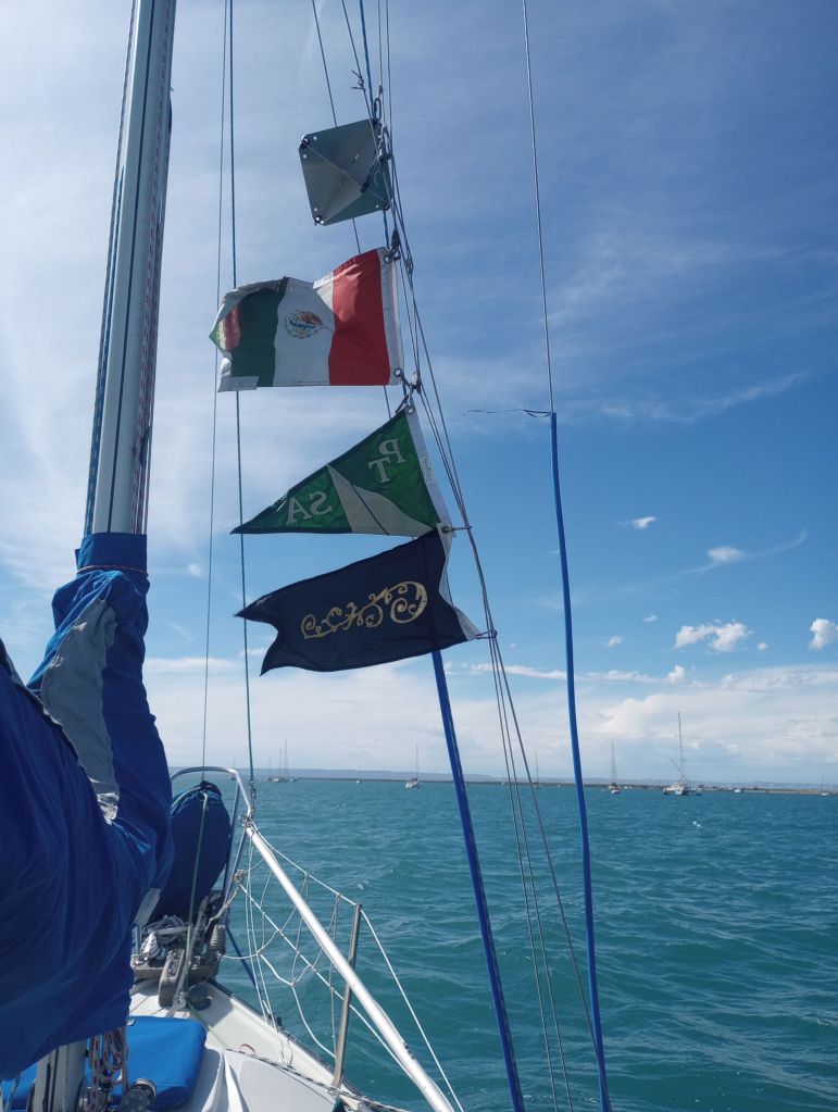 This is a bit of a feedback loop, but upon discovering their generous words, I raised their colors. Sampaguita sits at anchor in a windy and choppy La Paz anchorage. Her Mexican flag is showing the tatters of time, prone to flogging on the stays, part of being a small boat. The lowest flag is a Flicka flag displaying the filigree which helps define the breed.