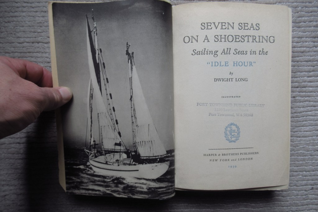 Another book recommended to me by Jack, also an attendee of the presentation, and found in the maritime section of the Port Townsend Public Library is Seven Seas on a Shoestring: Sailing All Seas in the Idle Hour by Dwight Long. I’m excited to both hold this 1939 first-edition copy in my hands and read it. Also in the queue.