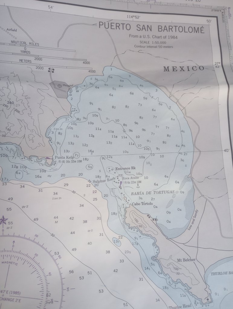 Regarding Mexican nautical charting, Dorothy, you are not in Kansas anymore. These are not the US charts you are accustomed to having a high degree of confidence in. There are many more uncharted navigational hazards, and some info is just wrong. Cases in point, one of the Baja Ha-Ha boats sank entering Bahia Tortuga last week. They were much closer to shore than recommended and they found an uncharted rock. The boat itself is also now a navigational hazard to boot. In the anchorage we’re in now there are uncharted rocks you can see when the tide is low. A very personal experience, I tried to anchor a few miles up the coast from where I am now. I was getting mixed signals from my antiquated depth sounder and the Navionics review of the anchorage. The Navionics charts themselves said there was 26 feet of water. I decided to drop the anchor and see. It went and went and went. 26 feet was more like 26 fathoms. No wonder the depth sounder seemed weird. I made the Herculean effort to get the anchor back on board and learned a very valuable lesson. On the bright side, better too deep than too shallow.