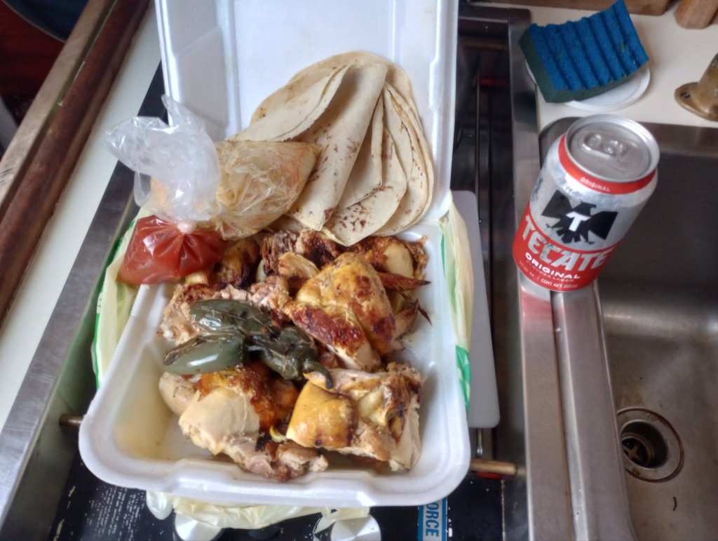 Dinghy Decisions 2: On Sunday, there was a southern breeze and I had spent the day in town. The south facing la playa had a bit of extra surf running and I got to practice my launch. I had picked up a BBQ chicken dinner from a couple who had been cooking them all day on the street. The chickens were splayed out flat on the grill and I had been considering it all day. It was more food than I needed and more pesos than I felt comfortable spending, but I finally pulled the trigger. It was reminiscent of Brook’s chicken (from Oneonta, NY) and I wasn’t going to have anything like that on the boat. Sunday is Sunday in Mexico and do as the Mexicans do. I could fit the container in my salty backpack and dry bag, but I still had to get it to the boat. There were some folks on the beach and they were going to get a gringo yatista show of triumph or disaster. Like any focused entertainer, I had to forget about them. I took my time on the launch and studied the swells coming in. I eased the kayak to the dynamic waterline, got everything ready, watching and judging where they began to break. No waves are the same and they come in trains. Still, it is difficult to tell further out as they hardly exist on the bay. When you decide to go, you must not hesitate. Committed is committed. You either make it or get soaked. Maybe both. There is no turning back. I suddenly went. I dragged the kayak the last few feet as the one wave was breaking and flooding the beach. My feet were getting wet regardless. I got in as that wave ebbed, giving me just enough water to float and drag me out. The kayak did start to turn sideways as it does, but grabbing the paddle, I straightened it out before I was left high and dry. Then it was paddle with all I had. I could see the next wave building and it was looking to be a terribly messy affair, but going for it was the only hope it wouldn’t be. I rode up and over that hill just before it was about to break, feeling like a miniature version of Tom Hanks launching his raft with the honey bucket sail in Cast Away. But I wasn’t through yet. The next wave was coming and starting to build. If it was bigger, it would break sooner, and really, who knew? But a bit further out I made it over in a less dramatic fashion and I was clear. I pumped my fist over my head in celebration in case the lookee-loos cared, but never looked back myself. And my 300-peso chicken dinner was preserved for my indulgence.