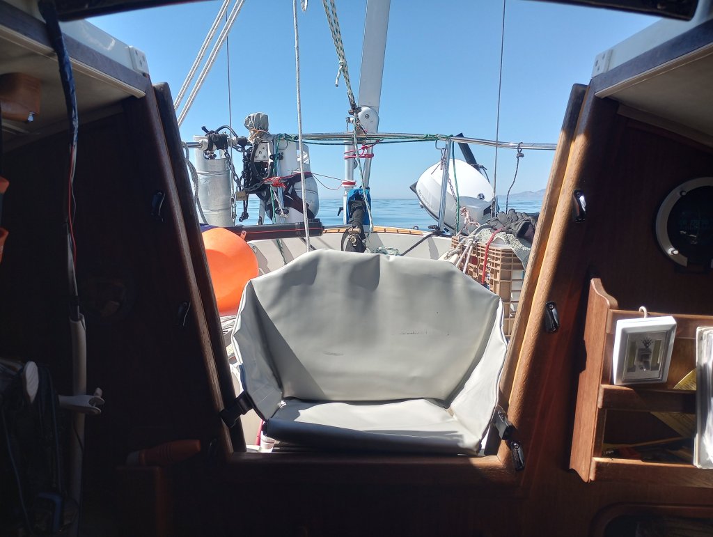 Boat Hack: On a small boat, crew is moveable ballast. At 160 pounds, I’m about 10 percent of the weight of provisions and stores in Sampaguita. So where I sit/stand matters. Here is the kayak seat I supervise from in the companionway. A compromise of keeping my weight low and forward, but high enough where I can keep a lookout.