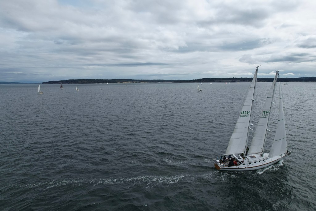 The Port Townsend Sailing Association’s committee boat, Committee, recently repowered with electric propulsion, was calling the shots for the day. Personed by PTSA board members and volunteers, they raise the flags, sound the horns, and other who-knows-what shenanigans. Pacific Cup-bound Sir Isaac won the Racing class and took line honors too. Next came the Thunderbirds, Port Townsend’s de facto one-design class won by the always competitive, Owl. The Cruising One class, made up of the larger cruising boats with the most entrants by far, saw the dark horse Amelie seize the day.